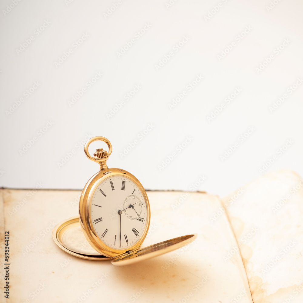 vintage gold pocket watch longines isolated on white background, pocket watch on books background