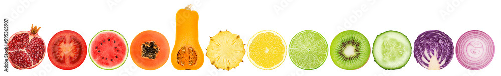 Collage of fresh color fruits, vegetables, berries, healthy food concept