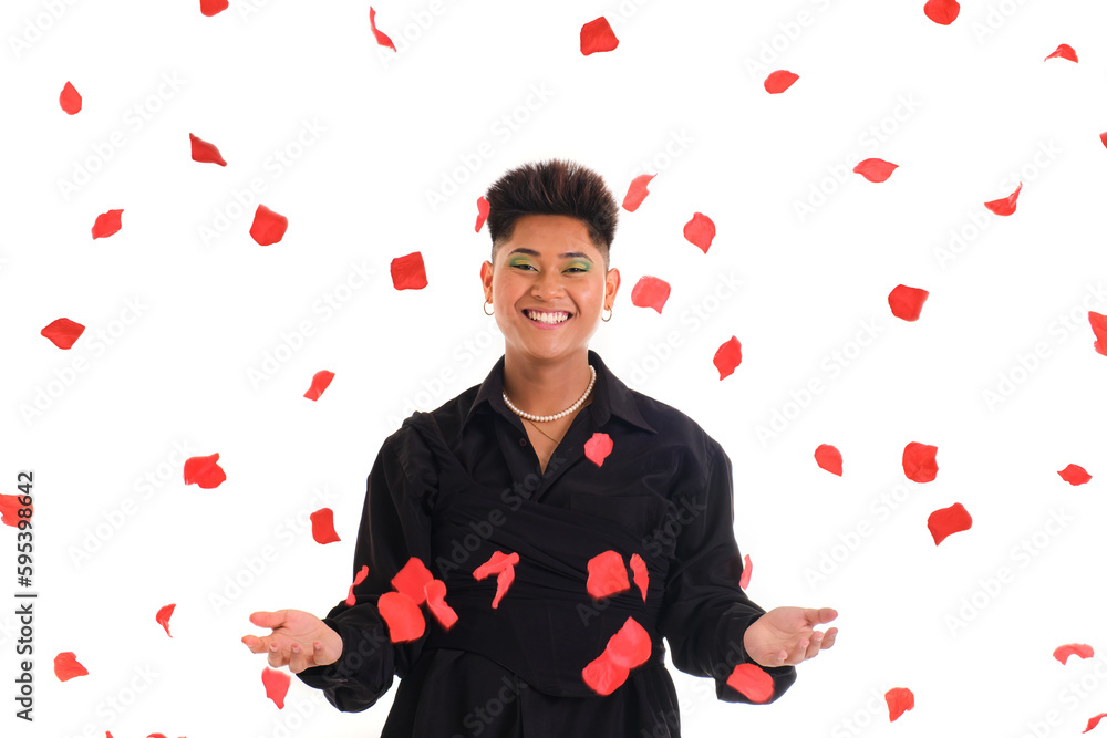 non binary asian person in black clothes smiling surrounded by red petals on white background