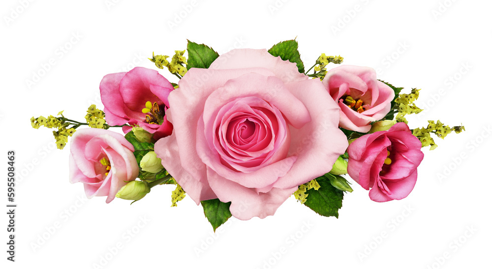 Pink rose, eustoma and yellow limonium flowers in a floral arrangement isolated on white or transparent background