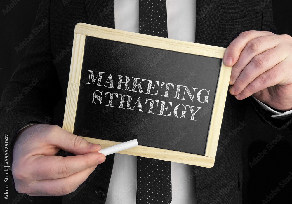 A businessman holds up a chalkboard with text MARKETING STRATEGY