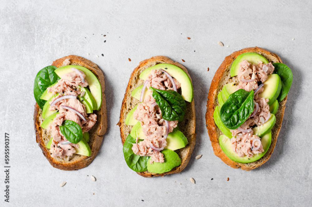 Tuna Avocado Toasts, Healthy Snack or Breakfast on Bright Background