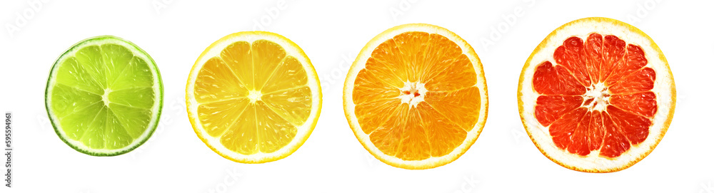 Collection of fresh citrus fruits isolated on white background. Slices of lime, lemon, orange, grapefruit.