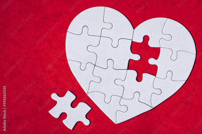Heart object made of puzzle pieces. Make complete heart. Jigsaw puzzle pieces in form of heart. Happy Valentines Day, greeting card template. Heart jigsaw puzzle.