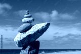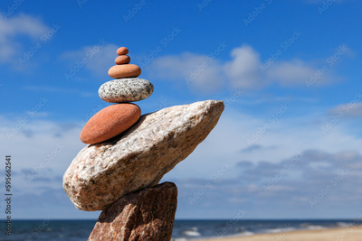 Rock zen pyramid of stones of different shapes on a background of blue sky and sea.