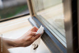 Woman cleaning window tiles with wet paper towel in sunny spring cleaning day close up of dirt and bacteria