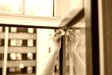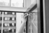 Woman cleaning window tiles with wet paper towel in sunny spring cleaning day close up of dirt and bacteria