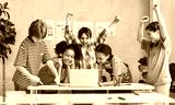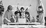 Cheerful schoolkids looking at laptop screen and celebrate successful completion of collective school work during online lesson.