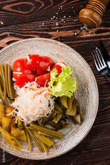 Pickled tomatoes, cucumbers, sweet peppers, garlic and sauerkraut in plate.
