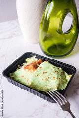 Hot green thin pancakes of spinach with coleslaw in plastic box.