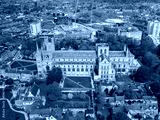 An aerial view of the Cathedral Church of St Peter, St Paul and St Andrew in Peterborough, Cambridgeshire, UK
