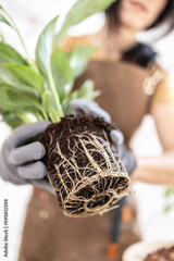 Selective focus, blurred midsection of female gardener holding in hands white peace lily, spathiphyllum. Closeup of houseplant root system. Selecting a pot for transplanting, repotting indoor plants