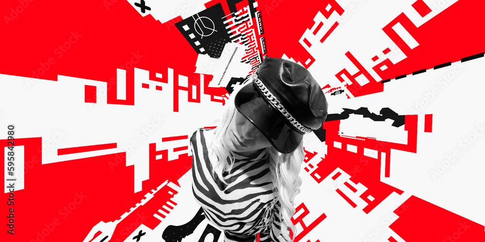 Contemporary digital collage art. Modern trippy design. Zebra fashion party girl