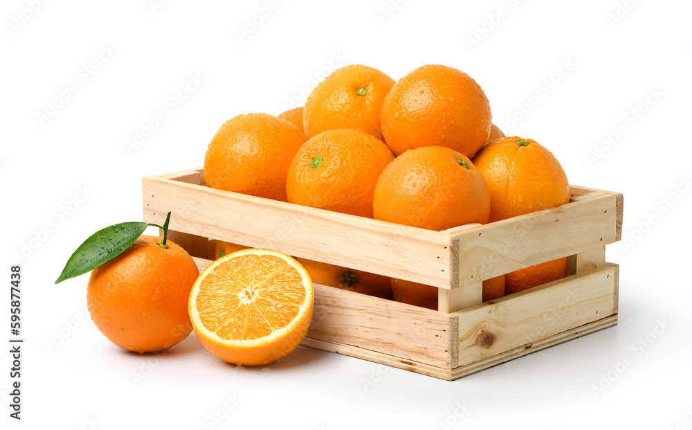 Fresh oranges with water droplets in wooden crate isolated on white background. Clipping path.