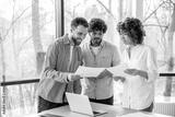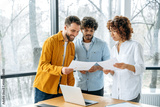 Creative business team. Positive multiracial partners gathered in office, confident businesspeople discuss new project, creative ideas, promotion strategy, analyze financial risks and profits, smile