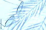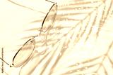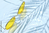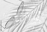Summer flat lay with yellow sunglasses on water background with shadows of palm leaves and copy space. Concept of summer hot day on beach.