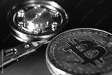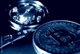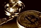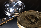 Gold Bitcoin on an open computer hard drive. Digital currency mining.