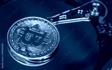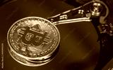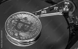Gold Bitcoin on an open computer hard drive. Digital currency mining.