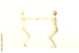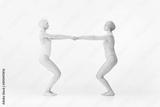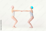Two young girls, swimming athletes in retro style swimsuits standing in jump position isolated over white background. Training. Concept of retro style, sport, fashion, youth, vintage