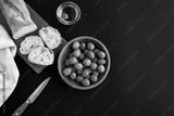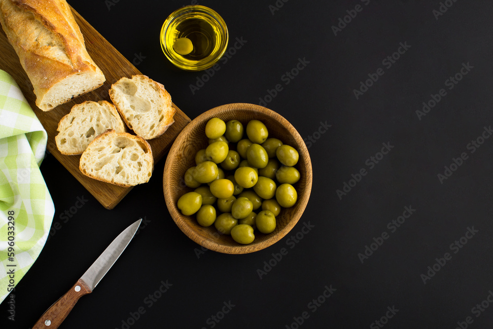 Green olive in the bowl and baguette on the black background. Top view. Copy space.