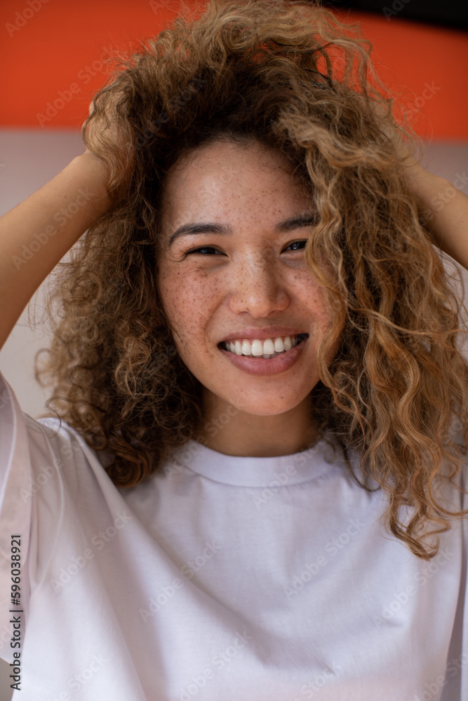 Attractive curly woman with freckles.