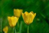 Amazing yellow tulip flowers blooming in a tulip field, against the background of blurry tulip flowers.