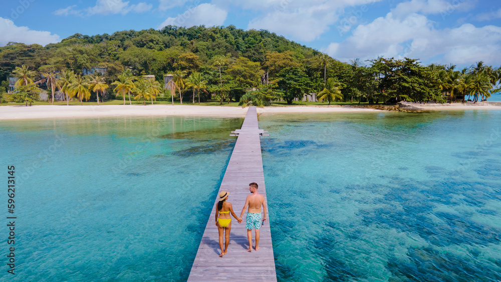 couple man and women on wooden board walk of a tropical Island in Thailand, Koh Kham near Koh Mak