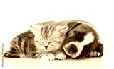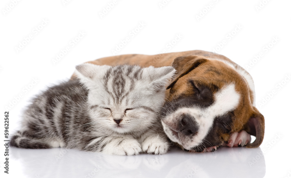 Scottish kitten and puppy sleeping together. isolated on white