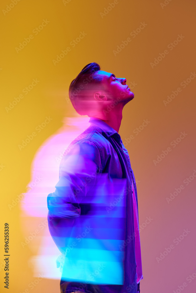Thoughts. Stylish, young, handsome man in casual clothes standing over yellow background with mixed neon lights effect. Concept of modern photography, art, cyberpunk, techno, creativity, fashion