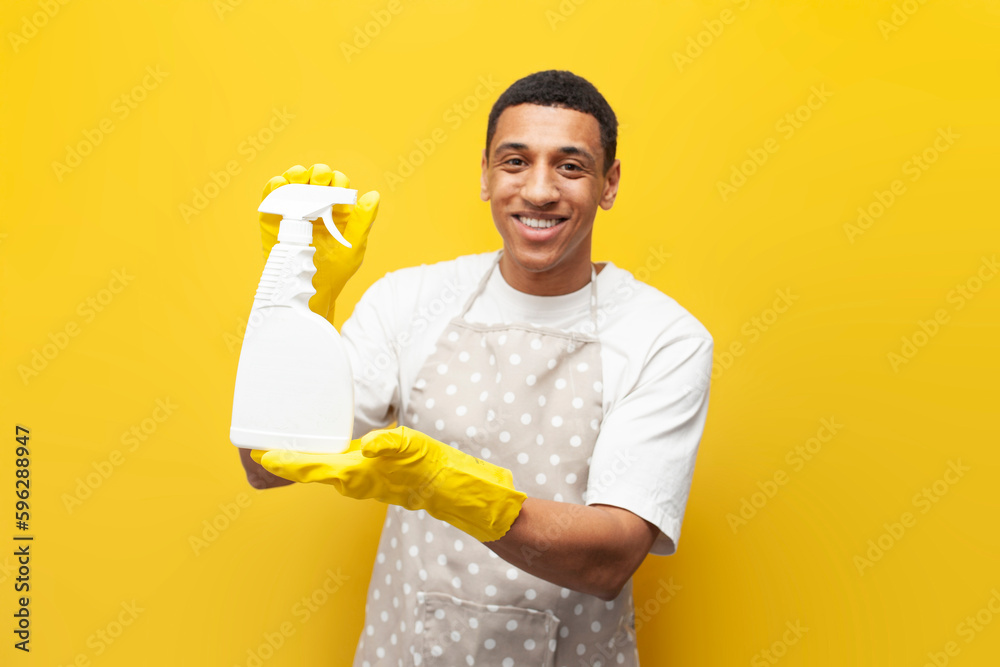 guy african american cleaner in apron holds gloves and detergent on yellow isolated background, cleaning service