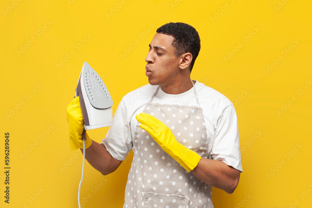 guy african american cleaner in apron and gloves holds hot iron and blows on it on yellow isolated background