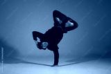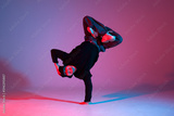 young guy dancer is dancing break in neon lighting, male acrobat is doing trick and dance exercise