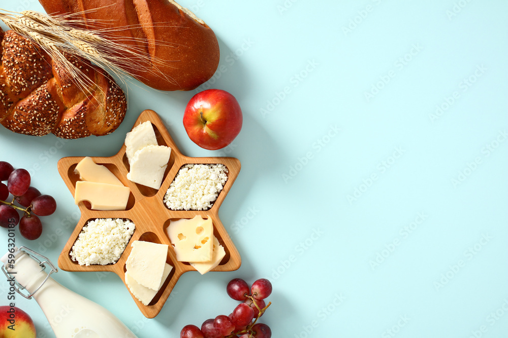Shavuot flat lay with dairy products, cheese, bread, grape, bottle of milk and wheat on light blue background. Happy Shavuot greeting card template.