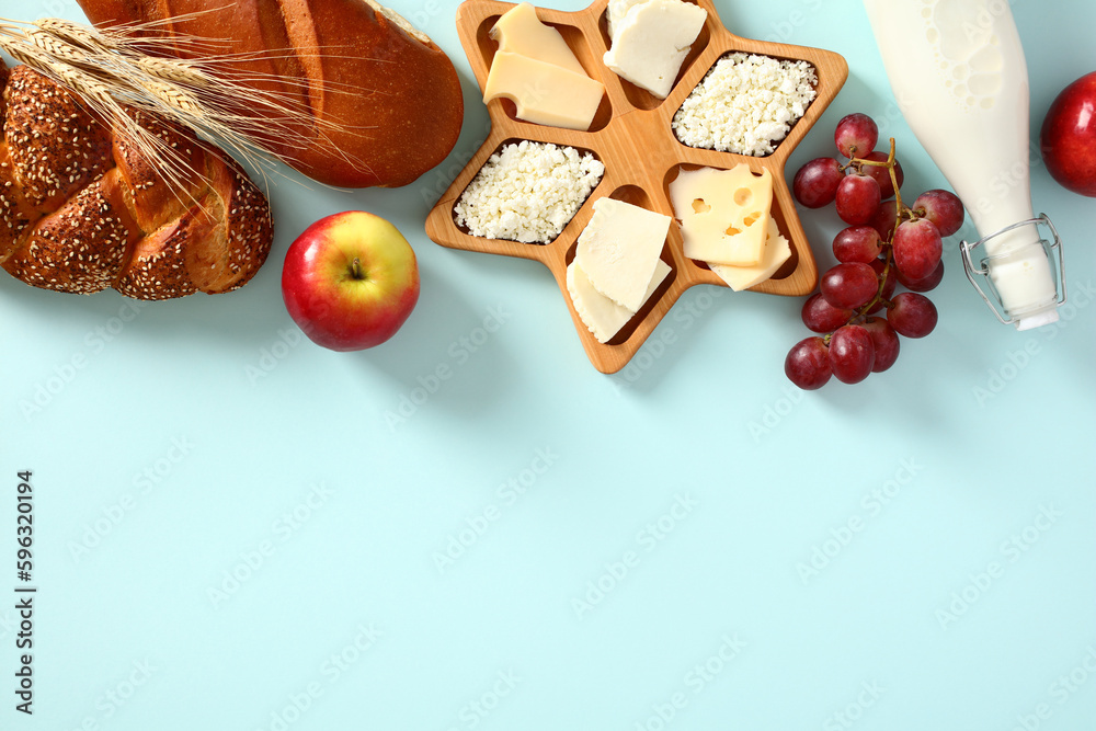 Happy Shavuot flat lay composition with dairy products, grape, apple, bottle of milk, bread on blue background. Top view, overhead.