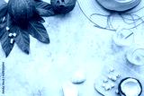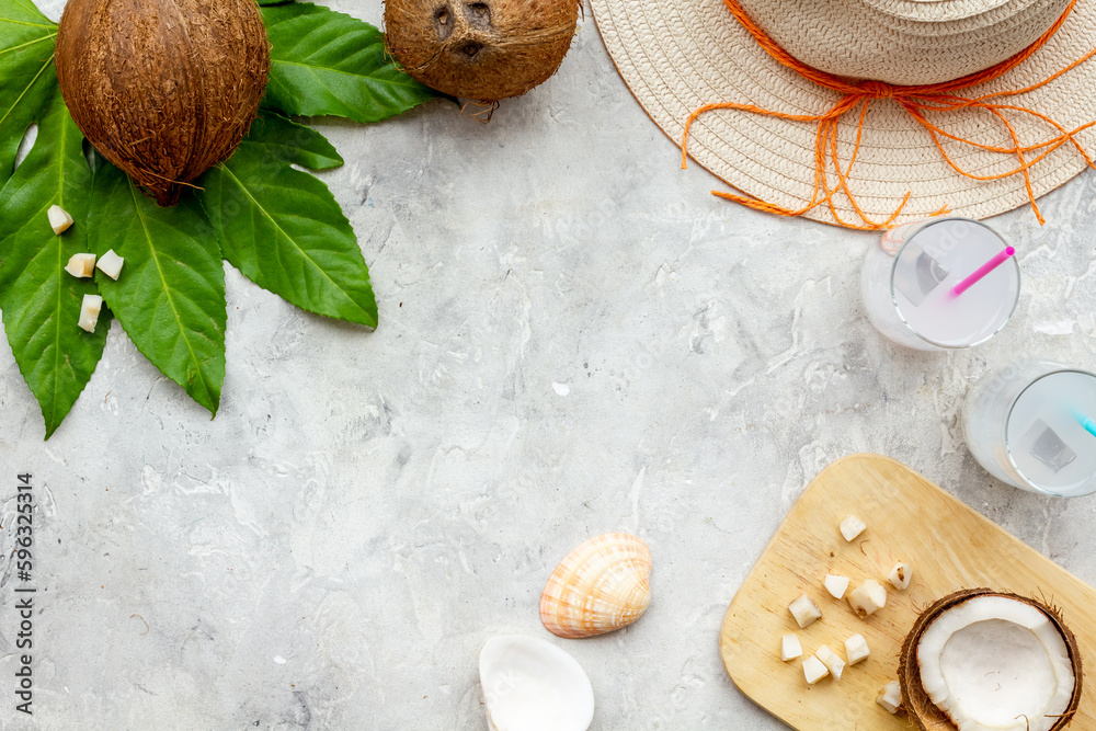 Coconut milk cocktail on the beach with a straw hat