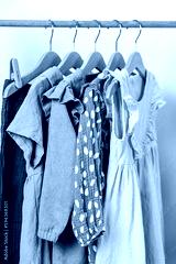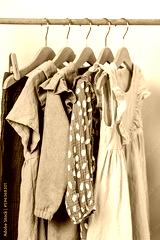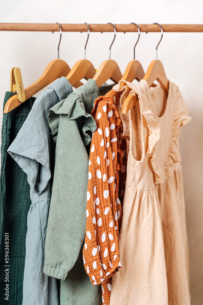 Wooden Clothing Rack with children's outfits close up. Fashion dresses in vintage colors on hangers in wardrobe. Kids wardrobe. Set of kids clothes and accessories for girl.