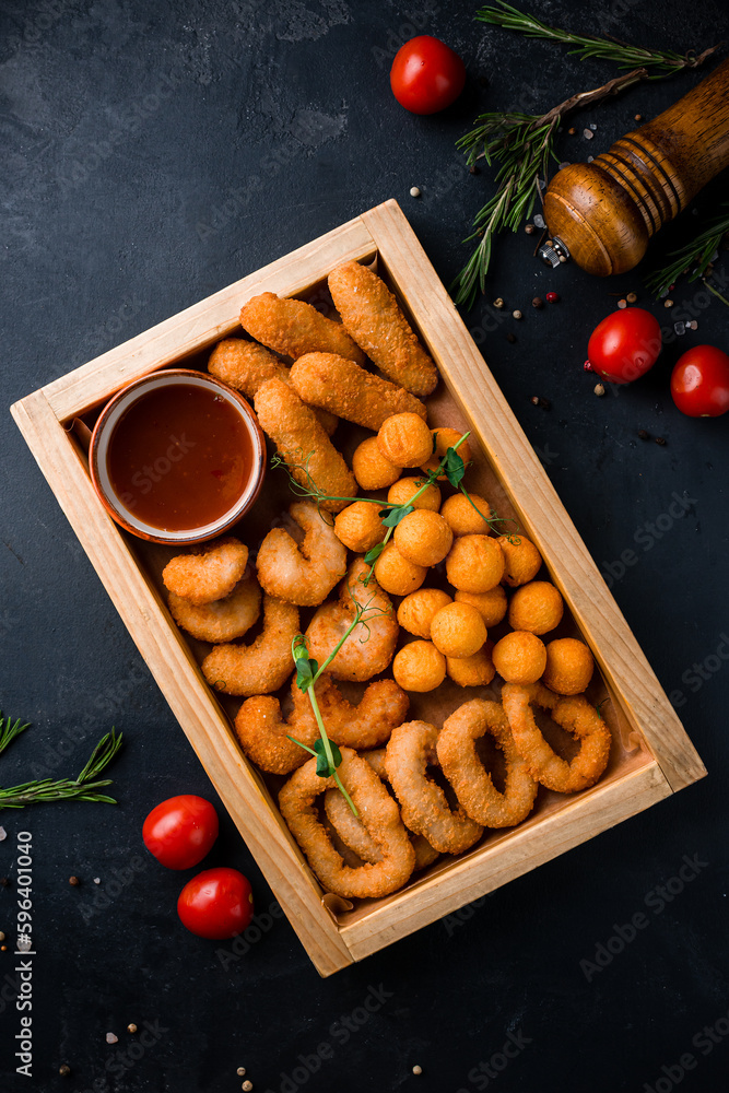 Snack fried nuggets, onion rings, breaded mozzarella cheese balls and shrimp and sauces.