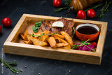 Fried pork fillet steak with potato wedges, marinated red onion and sauce.