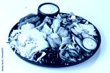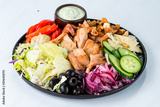 Fried chicken with tomatoes, lettuce, cucumbers, olives, croutons, parmesan cheese and sauce in plate.