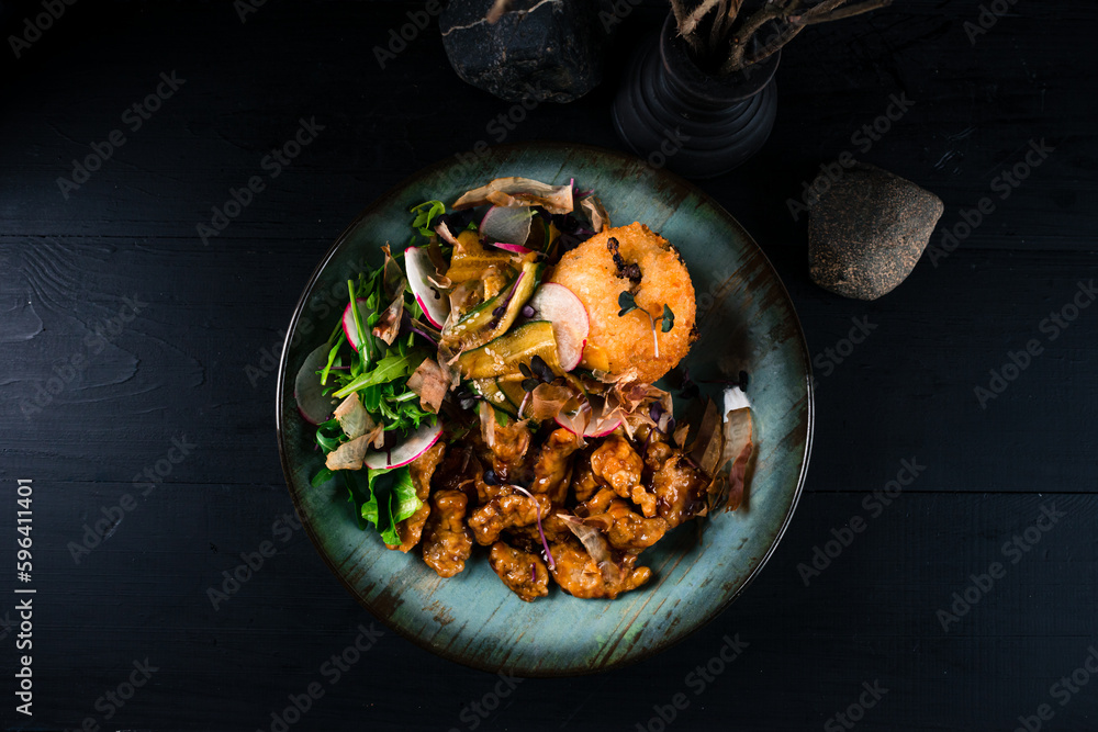 Fried pieces of beef fillet in sauce with cheese and fresh vegetable salad.
