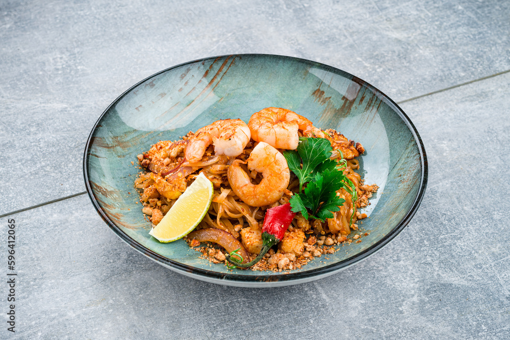 Lunch pasta with chicken, shrimp, nuts, lime and greens.