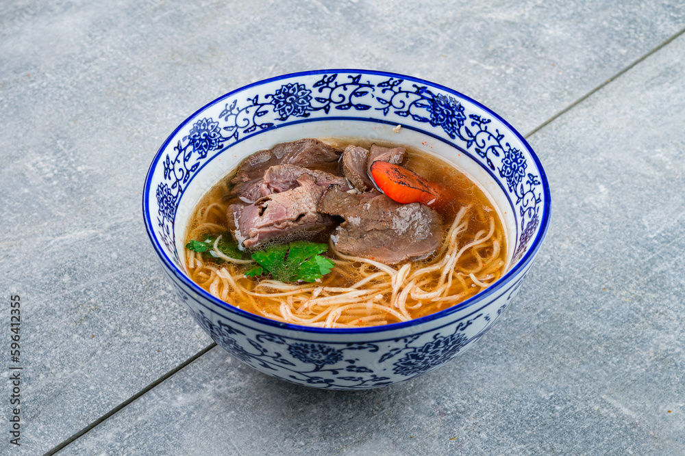 Japanese Ramen soup with noodles, beef, sweet pepper and greens.