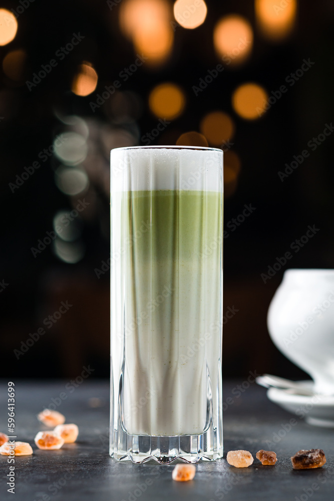 Green matcha latte tea in a glass.