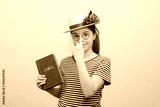 Romantic Literature. A girl in a retro fashion of yesteryear, a straw hat with flowers, glasses and a book in her hand.