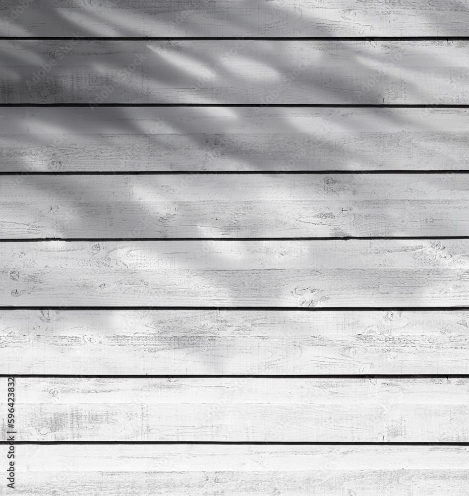 White wood texture background with tropical leaves shadow, Washed old wooden striped surface, Vintage fence wall with sunbeam,Background plank for table, floor