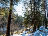 Die Weissach vom verschneite Ufer zwischen Kreuther tal und Enterbach entlang Walderpfad von Buchenmischwald und nördliche Kiefern gesäumt