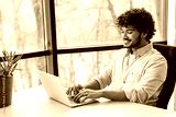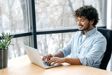 Positive indian or arabian businessman, company employee, ceo, manager, sits at workplace in the office, working on a laptop, planning new project, developing strategy and promotion