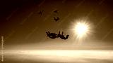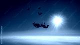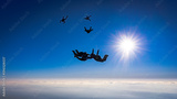Skydiver group builds formation in the blue sky silhouette