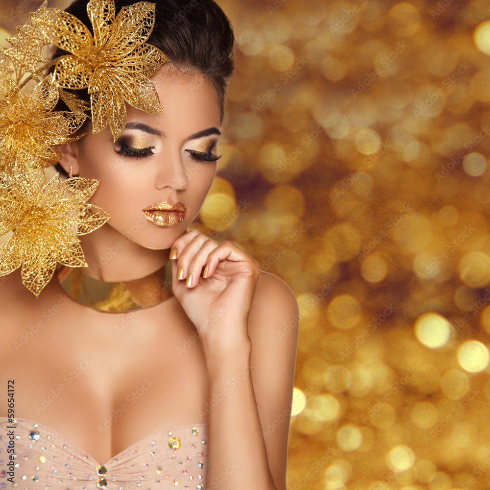 Fashion Beauty Girl portrait with flowers Isolated on golden bok