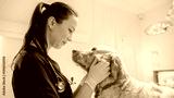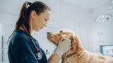 Beautiful Female Veterinarian Petting a Noble Golden Retriever Dog. Healthy Pet on a Check Up Visit in Modern Veterinary Clinic with Happy Caring Doctor